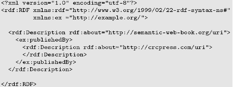 rdf:Description的element包含对resource的描述,并被rdf:about识别 ex:publishedBy也蕴含了resource常常用作谓语